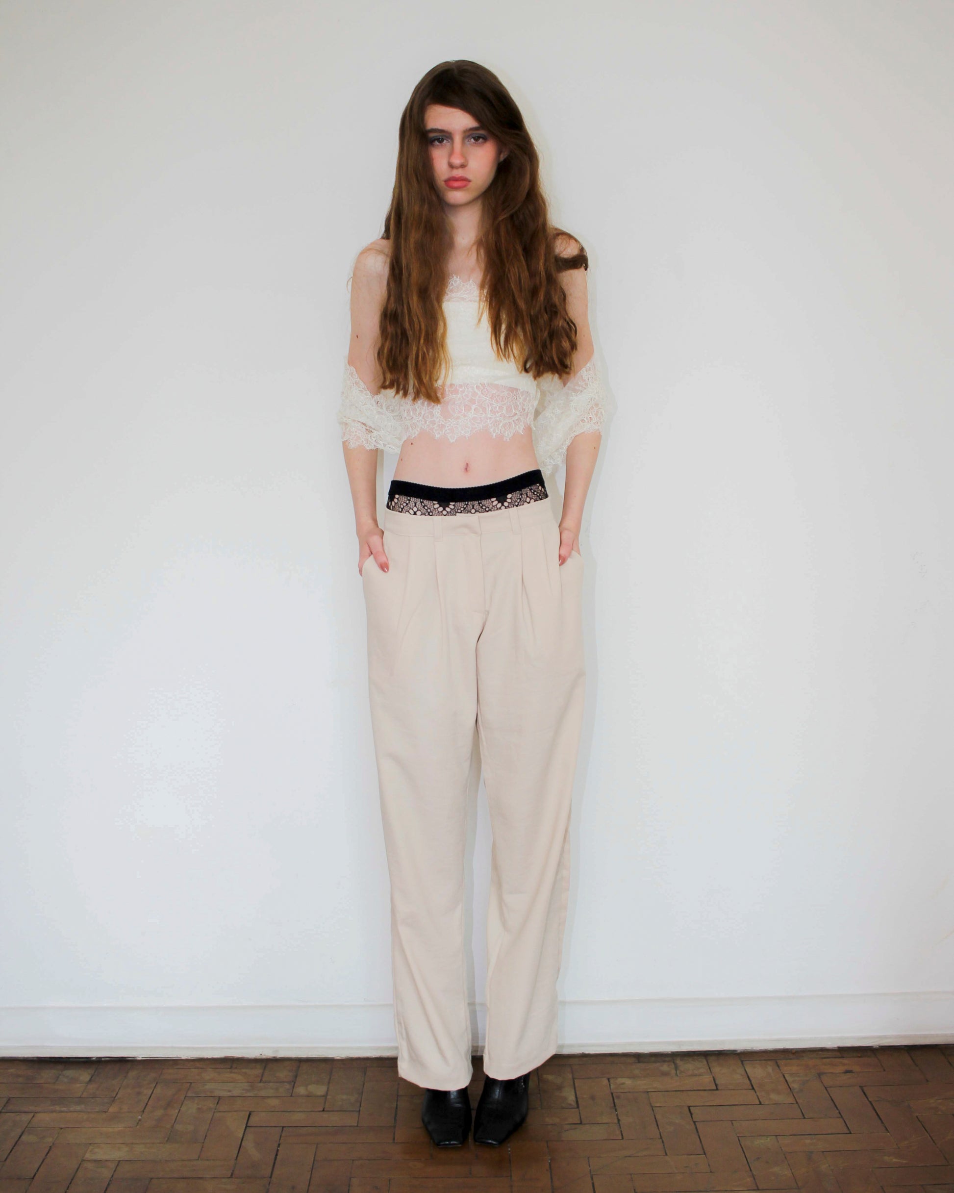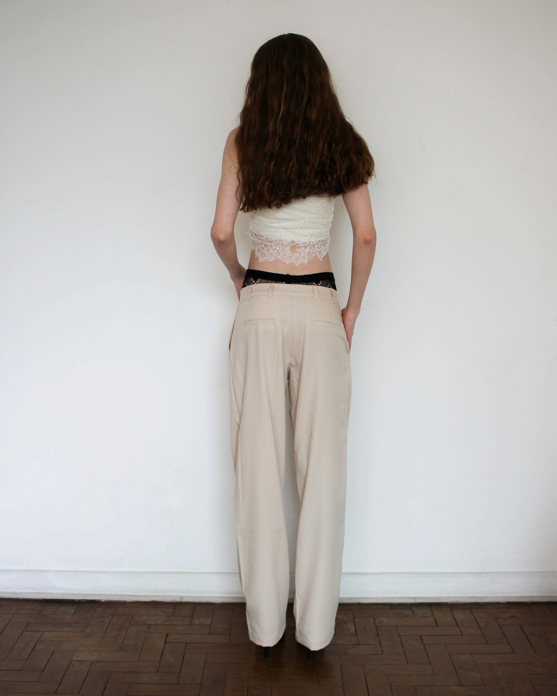 Calça alfaiataria estilo retrô em tecido com aspecto de linho. Possui pregas que deixam o caimento da calça mais amplo