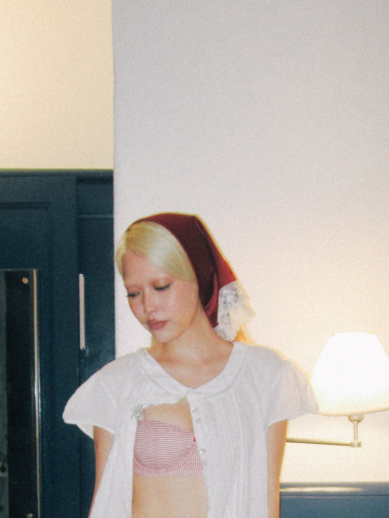 Lenço feito de tecido acetinado, com barras em aviamento de renda. Possui bordado industrial com o "K" da marca.