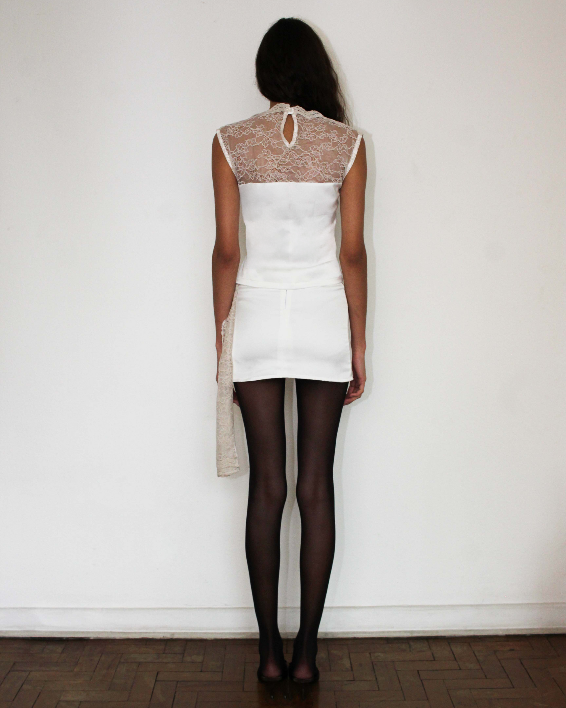 Mini saia com renda como cobertura e faixa lateral.