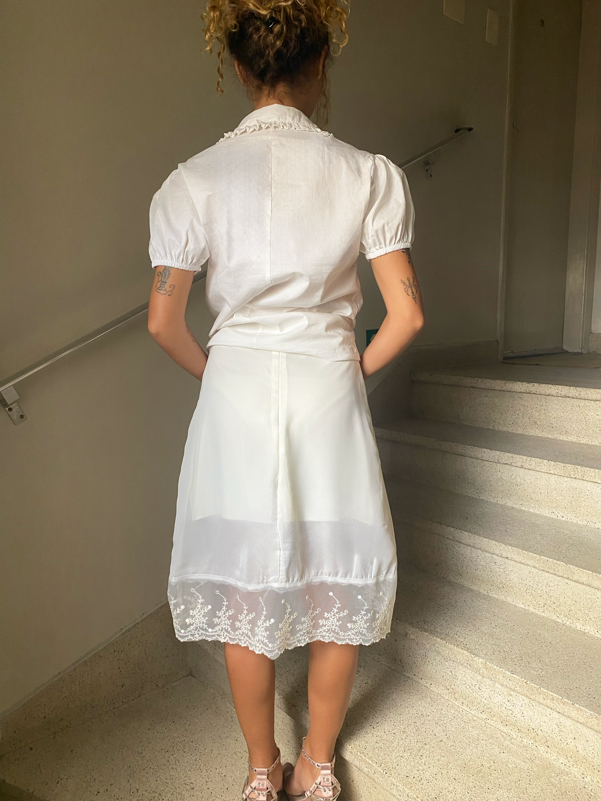 Saia com corte sereia. Possui forro em cetim toque de reda e uma camada de chiffon toque de seda, que traz uma camada de textura e transparência. No barrado, possui um aviamento de renda artesanal.