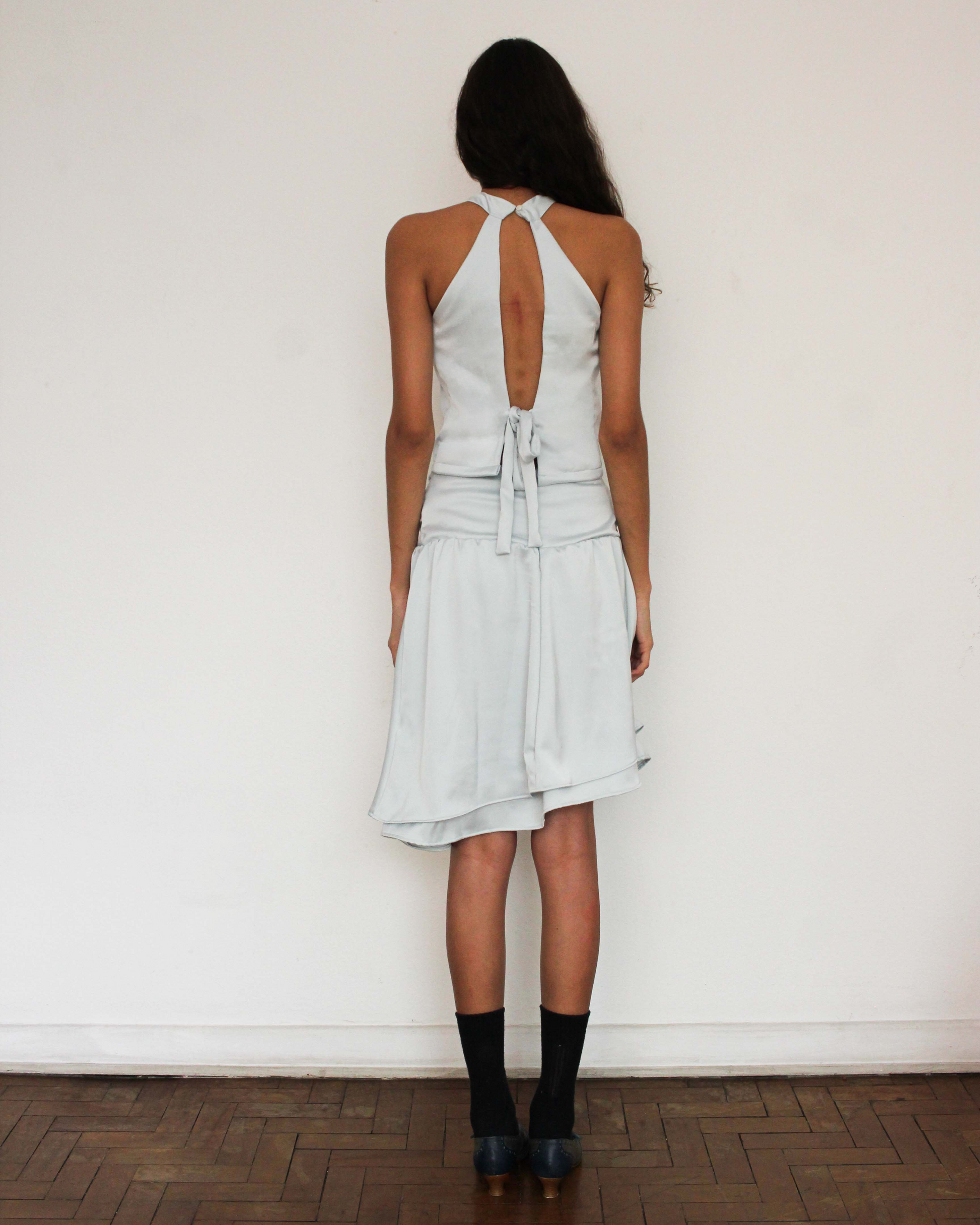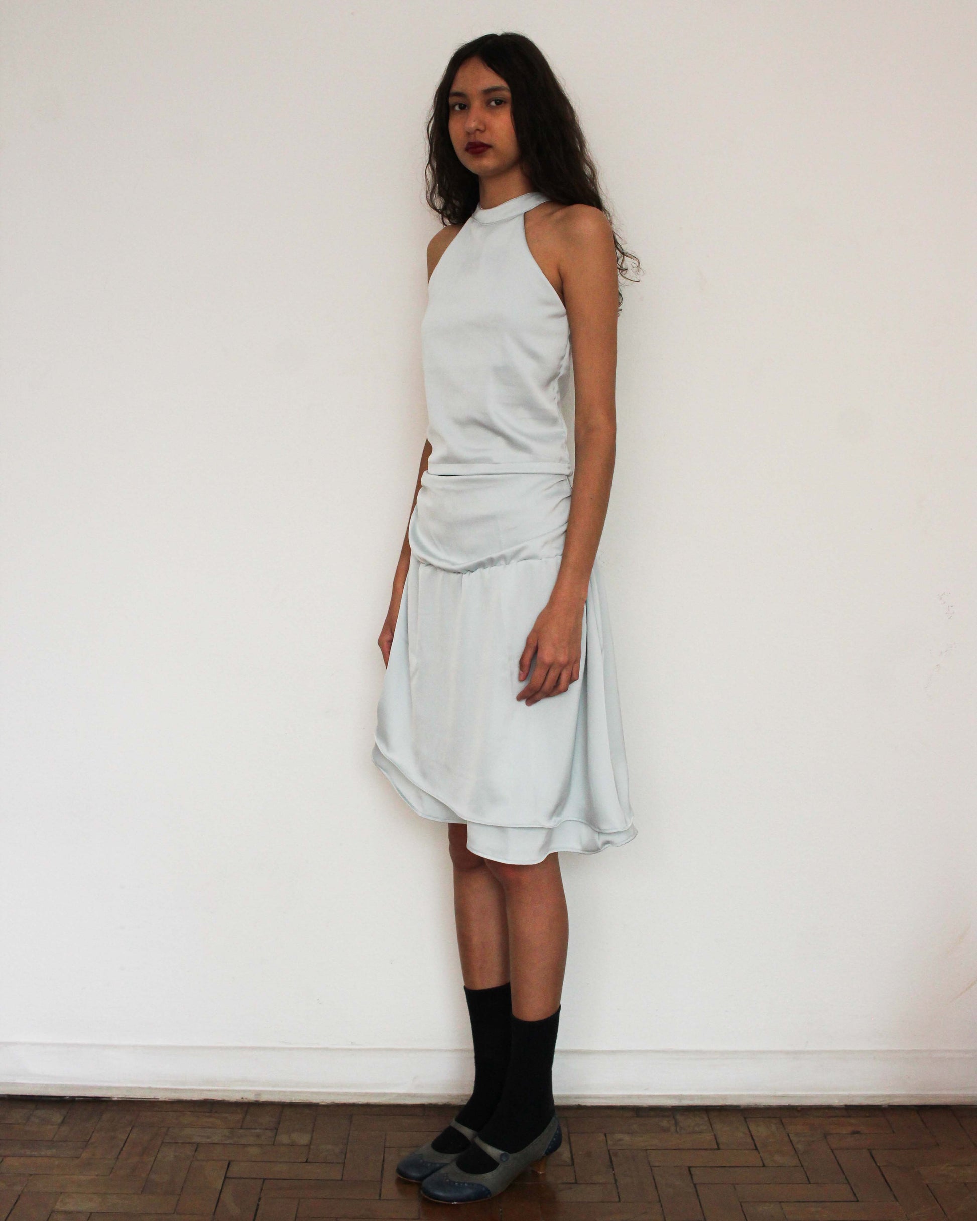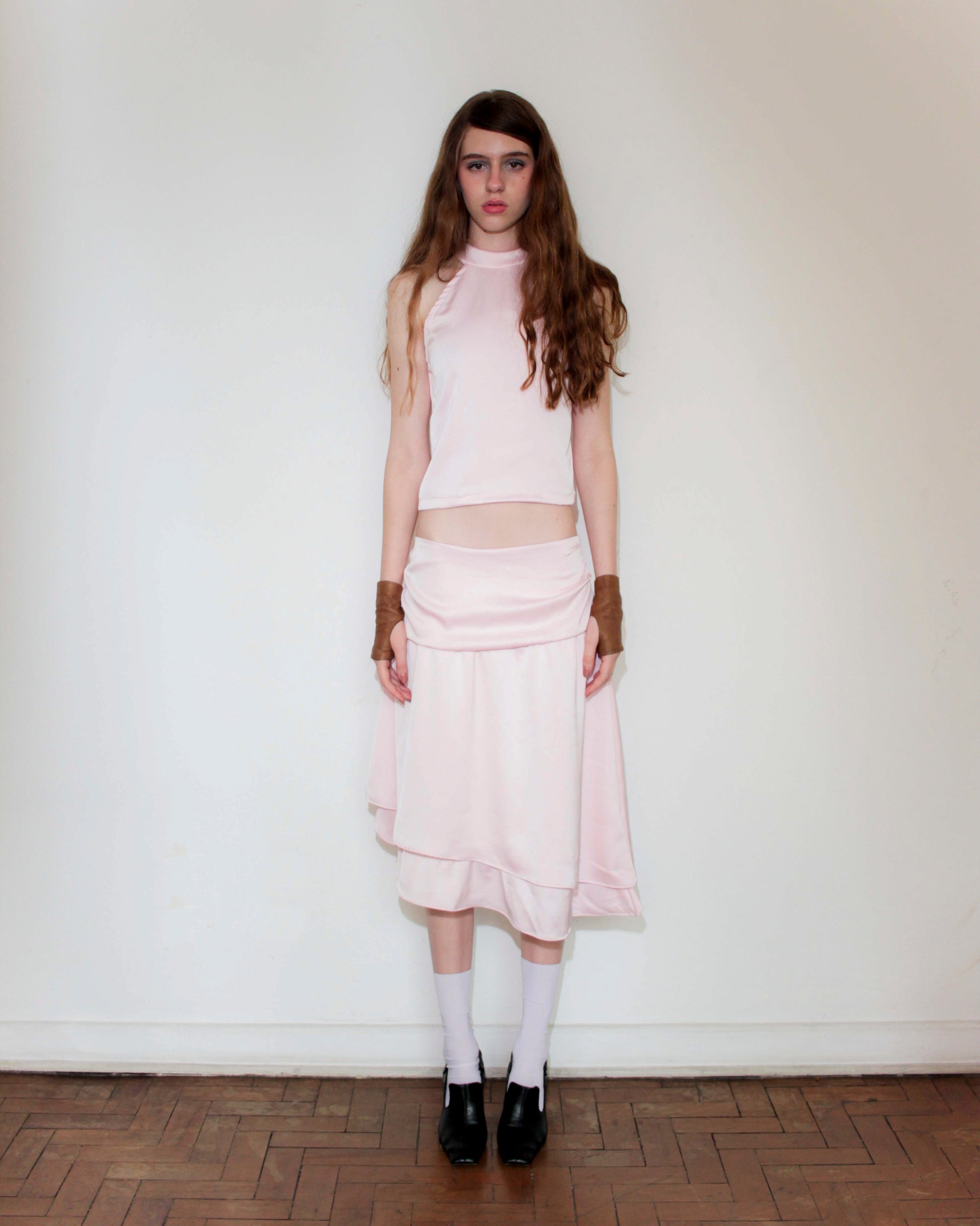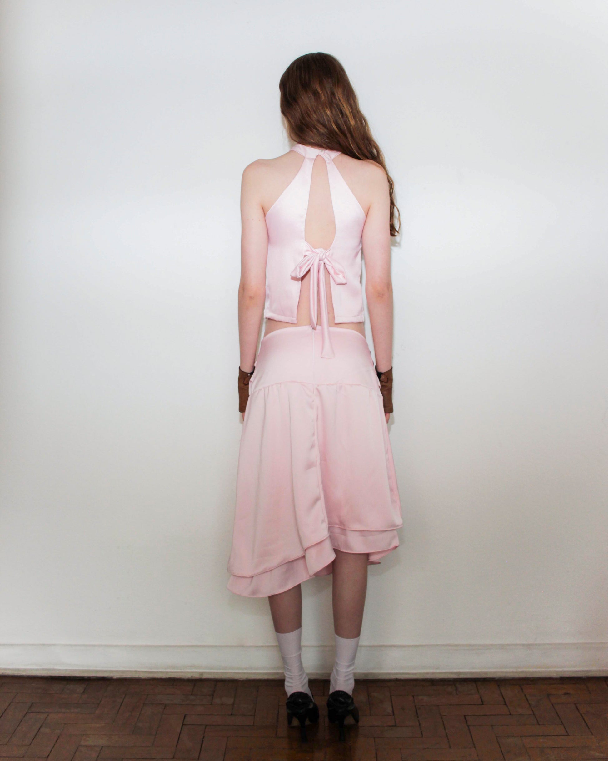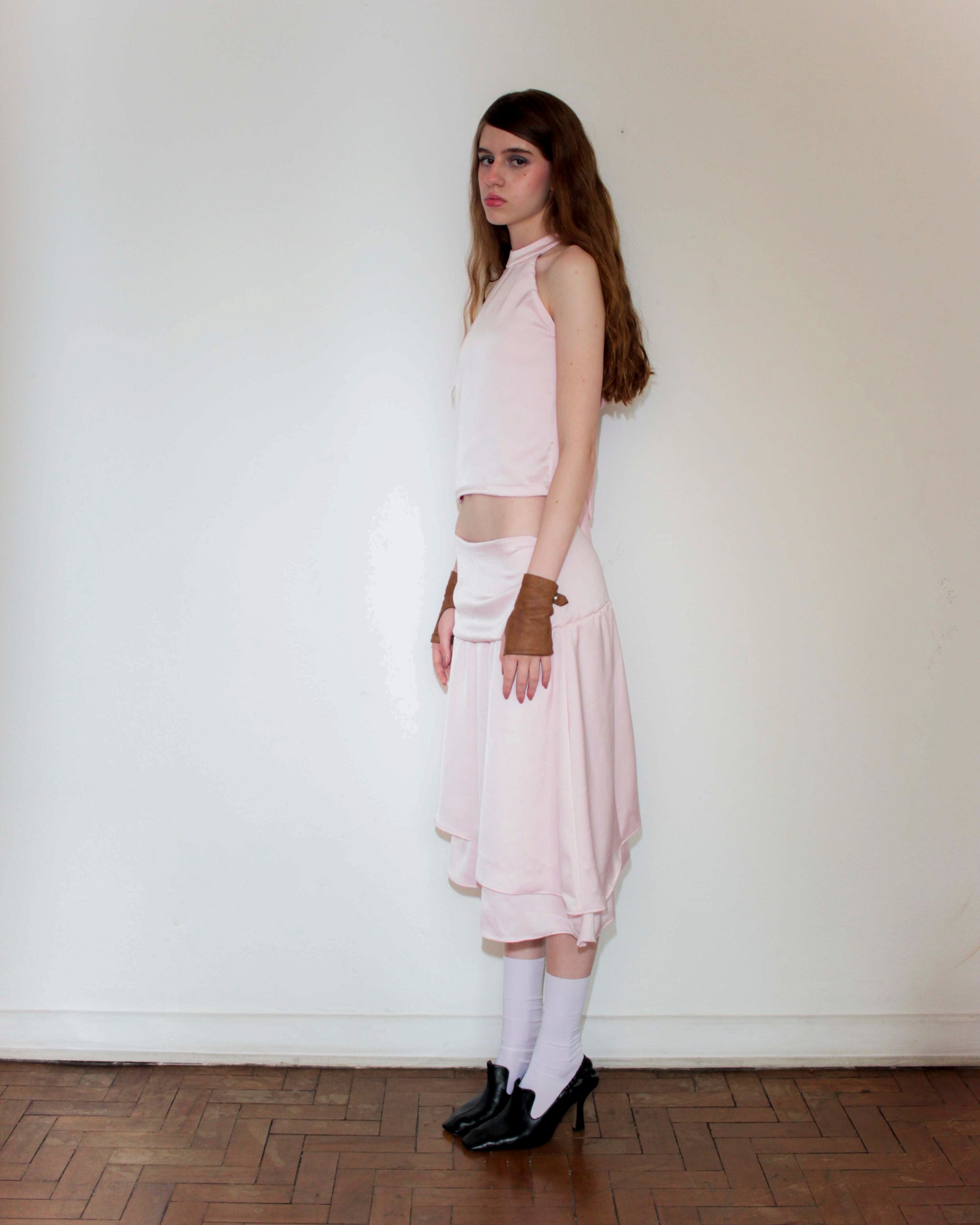 Saia com caimento assimétrico e camadas de tecidos. Comprimento midi.